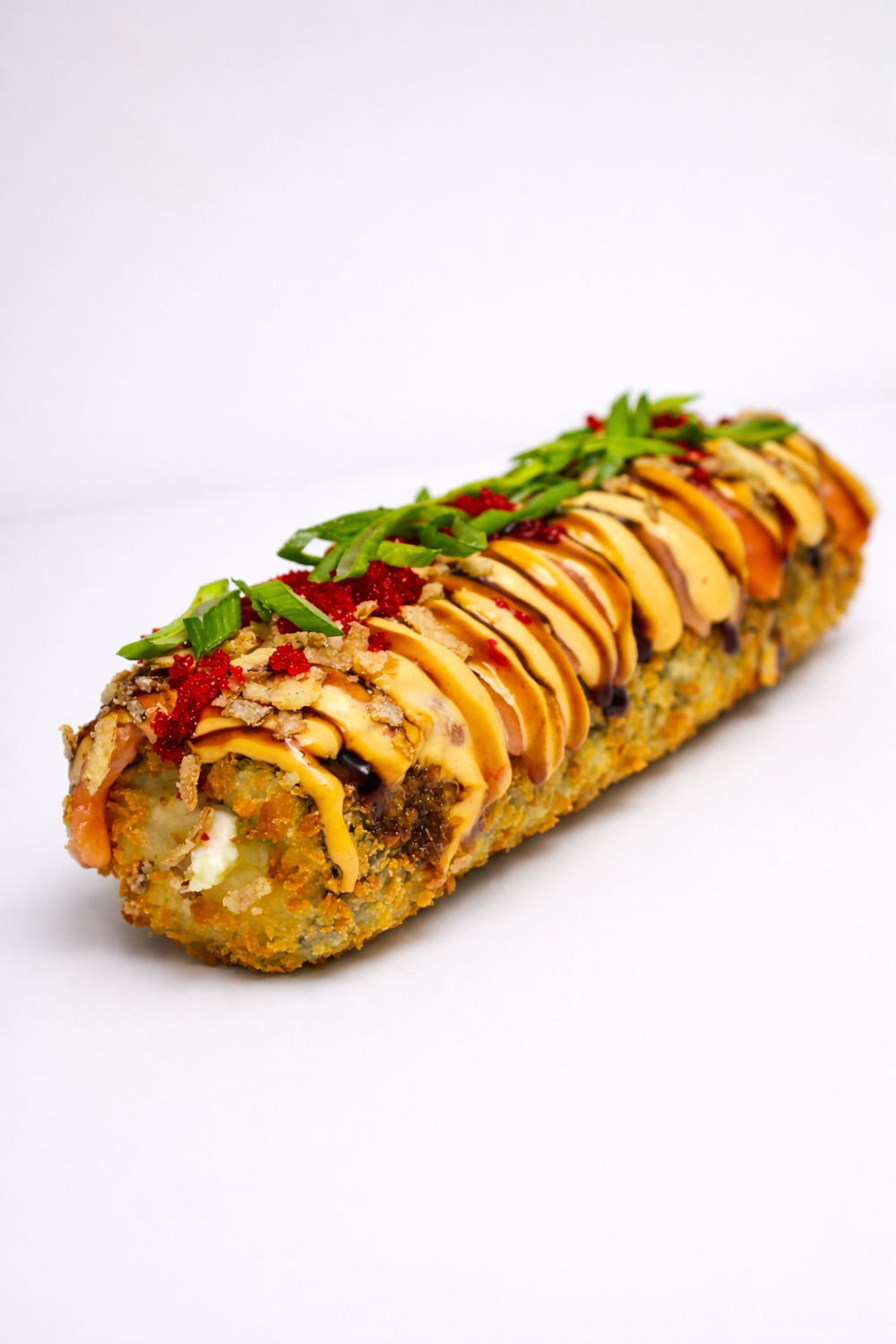Рис и нори, лосось, свежий огурец и нежный творожный сыр. Сверху соус терияки, фирменный соус, красная масаго, хрустящий жареный и зелёный лук.